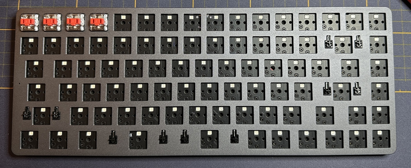 Ok. On to assembly. I only have two real complaints here and they’re related. First, holy fuck choc stabilizers are fiddly as hell. I used the Keeb.io installation guide to figure it out and still fucked it up a couple times. I dislike MX stabilizers with a passion and making them even tinier did not make me feel better. Choc stabs are plate mounted, with no screws. The L75 case backs them up with metal columns from the case so they shouldn’t work loose but time will tell.