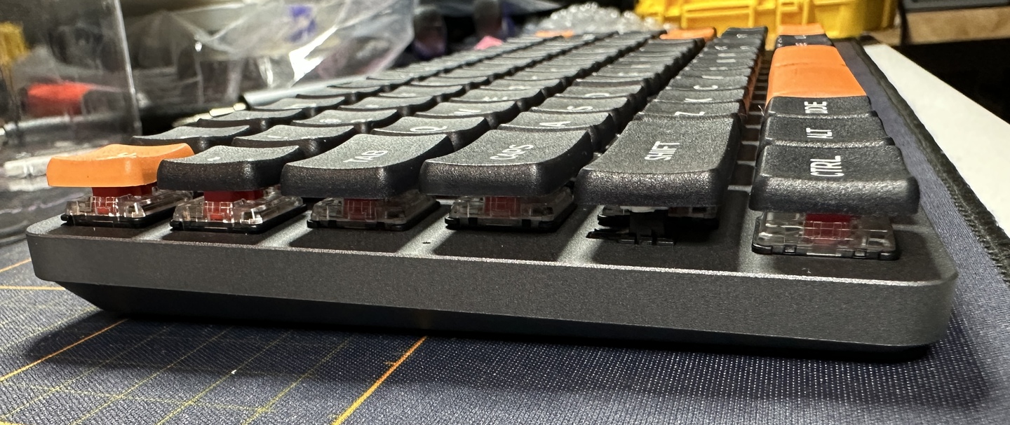 Near as I can tell, the split space bar will always be two space bars. Maybe the sketchy windows apps can change this but I’m not aware of a way, out of the box, to customize them. I’d love to match my split keyboard layout of space and enter on my thumbs. More problematically, the split space bar is split down the center. If you hit the spacebar on, say, your laptop keyboard in the center of the bar, the L75 will drive you up a wall. I am constantly hitting the gap between the halves and am constantly reminding myself to bring my thumb in closer. I’m sure I’d get used to it if this were my only board, but right now, oof it’s annoying.