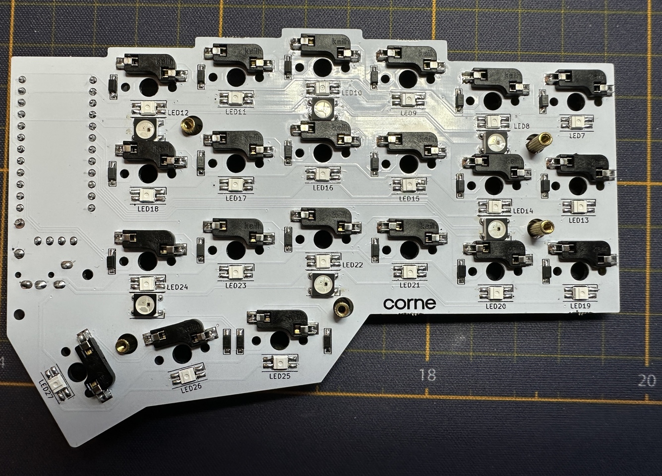 The v2.1 Choc Corne however is a bit trickier. Unlike the v3, the v2 is a reversible board. If you’ve read my other keyboard posts, you likely know how much I hate reversible boards. The build guide is pretty clear but pay special attention to the MCU header location for each half. The LEDs on the choc corne are awful, in my opinion, and I never use them. They are installed by taping LEDs into holes and jumping solder bridges onto the pads. They’re a huge pain in my opinion. If you don’t care about LEDs, the v2.1 isn’t the worst build ever.